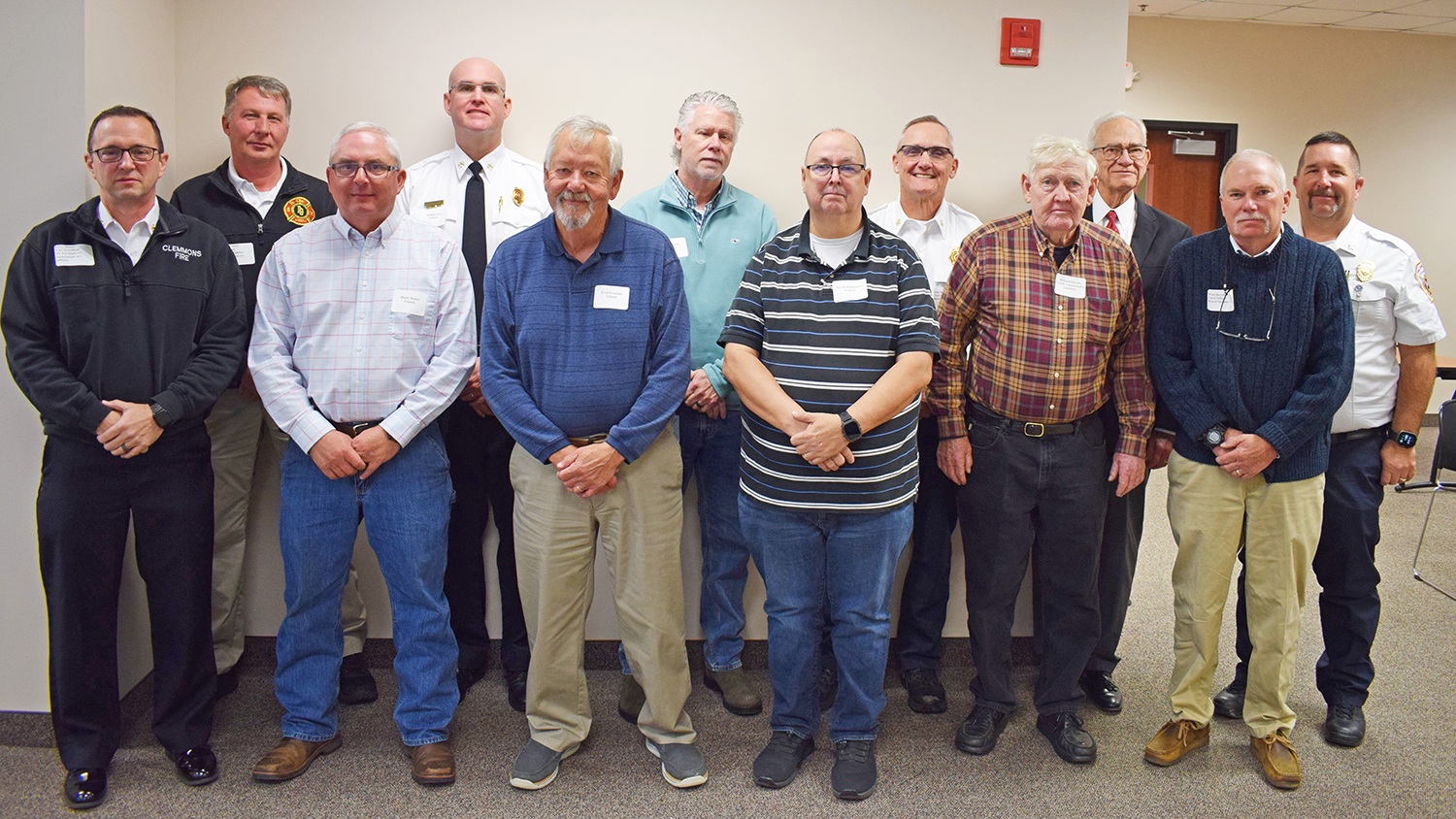 The Commission is comprised of (Front Row) County Firefighter Association VP Gary Styers, Shane Moore, Fred Franklin, David Williamson, Commissioner Richard Linville, Vienna Assistant Chief Walt Beroth, (Back Row) County Firefighters Association President Carl Walker, William Gray, Brian Tuttle, Walkertown Chief Eddie Bottoms, Commissioner Don Martin and King Chief Steven Roberson.